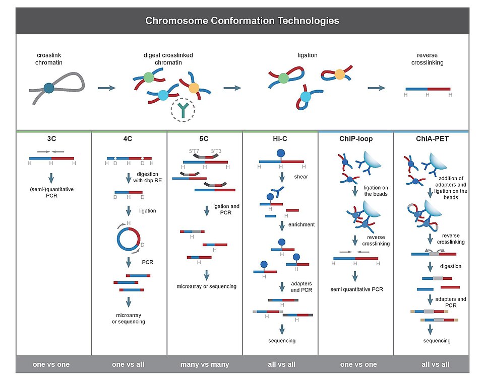 - Лигирование — соединяют "соседние" фрагменты ДНК, которые в момент фиксации находились рядом в ядре, создавая цепи контактов.