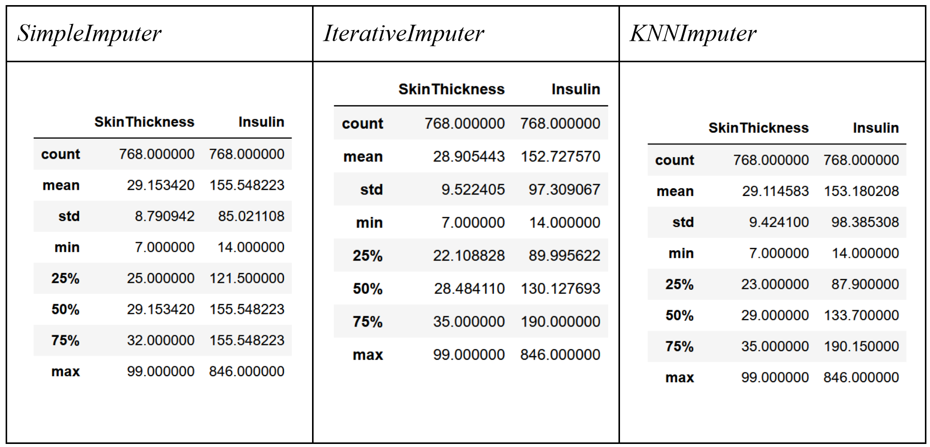 Для лучшего понимания стоит рассмотреть пример. Представьте, что у вас есть таблица с информацией о пациентах: возраст, пол, уровень холестерина. В некоторых записях отсутствует показатель холестерина. Варианты заполнения этой пропущенной информации, использовать среднее значение, медиану, значения из других строк и т.д..